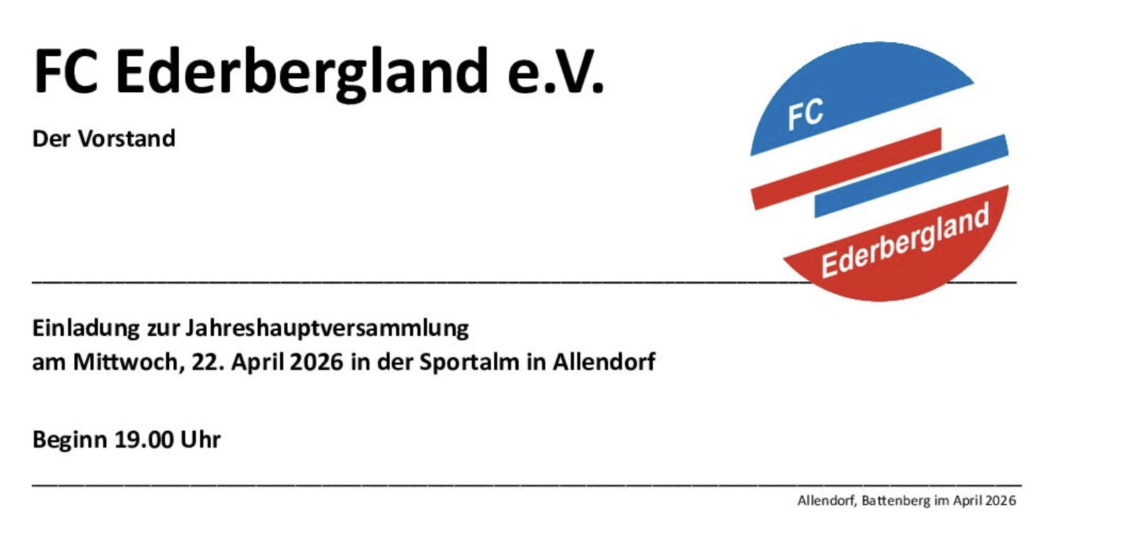 Der FC Ederbergland lädt alle Mitglieder zur Jahreshauptversammlung ein.